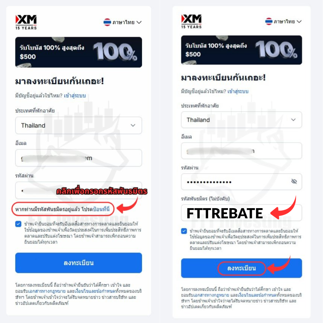 รหัสพันธมิตร FTTREBATE ก่อนกดยอมรับเงื่อนไขและ “ลงทะเบียน”